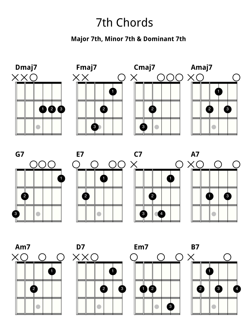 7th chords come up pretty quickly in chord playing, because there’s a heap of really easy ones to play from open position, and sometimes they’re actually easier to play than regular major and minor chords!