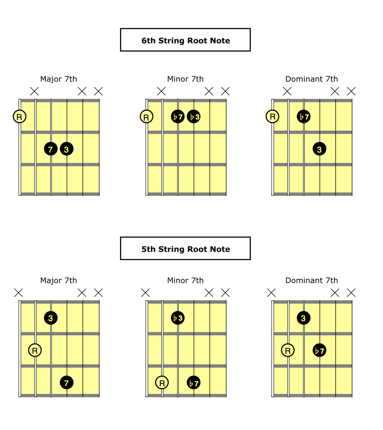 Some common examples of nice shell chords, which also show where the root, 3rd and 7th is located!